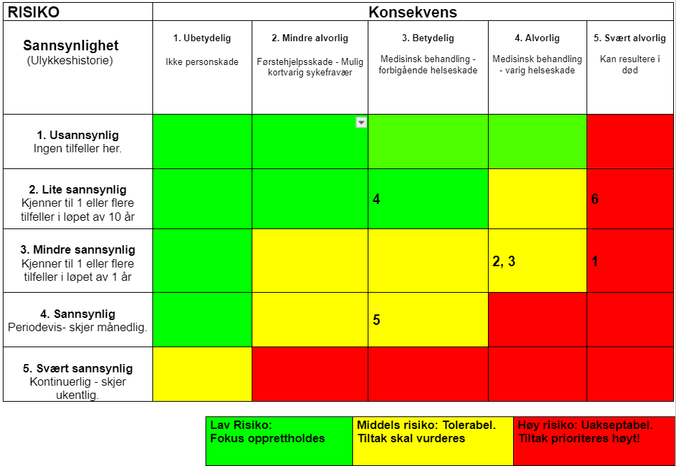 Hver enkelt risiko har fått et tall som er plassert i tabellen over. Forklaring på risikoene kan du lese mer om i tabellen under: